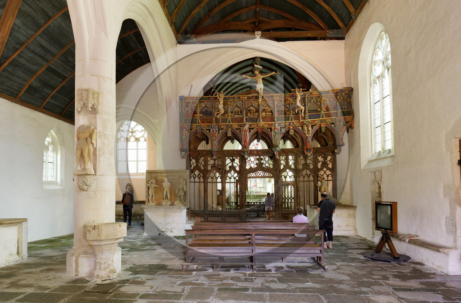 | Description | France, Morbihan (56), Ètape sur le chemin de Saint-Jacques de Compostelle, Le FaouÎt, chapelle Saint-Fiacre du XVe siËcle, le jubÈ polychrome en bois considÈrÈ comme l'un des plus beaux de France |