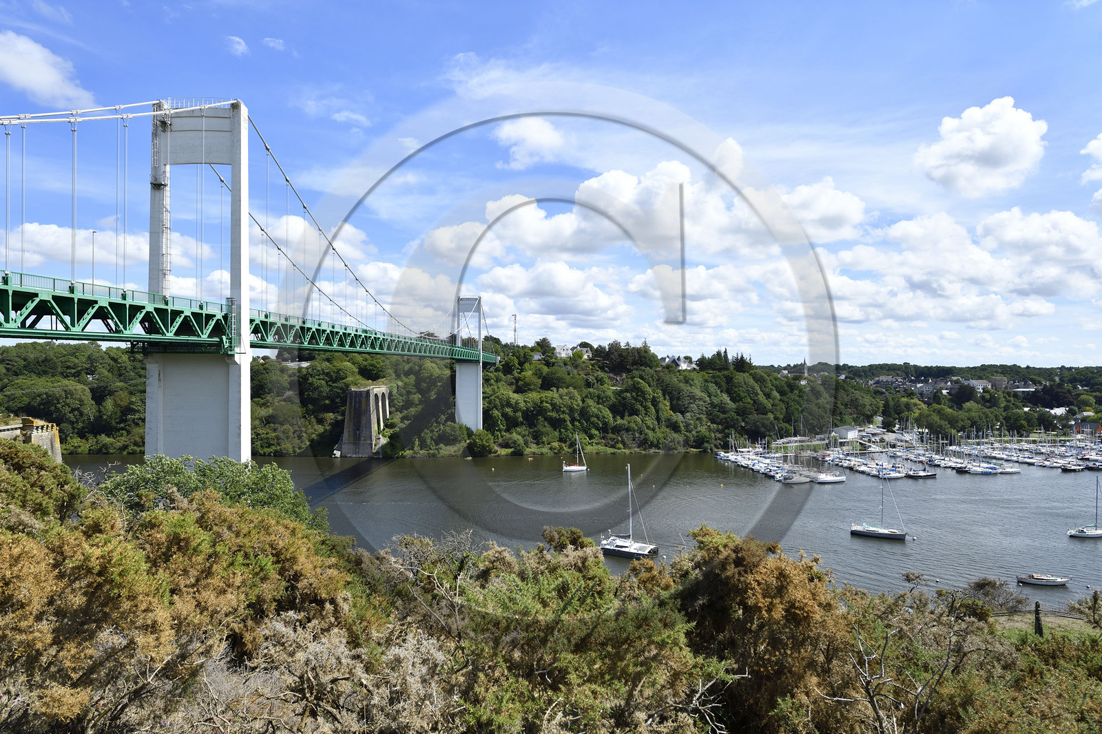 France, Morbihan (56), La Roche-Bernard, le pont suspendu sur la Vilaine et le port de plaisance